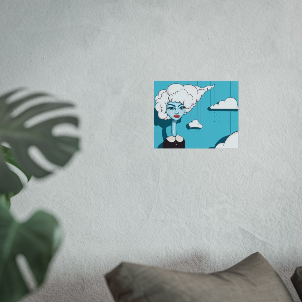 A whimsical fine art poster that blends vintage portraiture with dreamy surrealism. The cool teal palette and ornate frame draw the eye to a stylized figure whose cloud-like hair and distant gaze suggest gentle longing. Subtle cloud motifs and soft matte tones make this print feel both modern and nostalgic — a quiet conversation piece that brings calm, curiosity, and a touch of gallery elegance to a living room wall, studio nook, or reading corner.