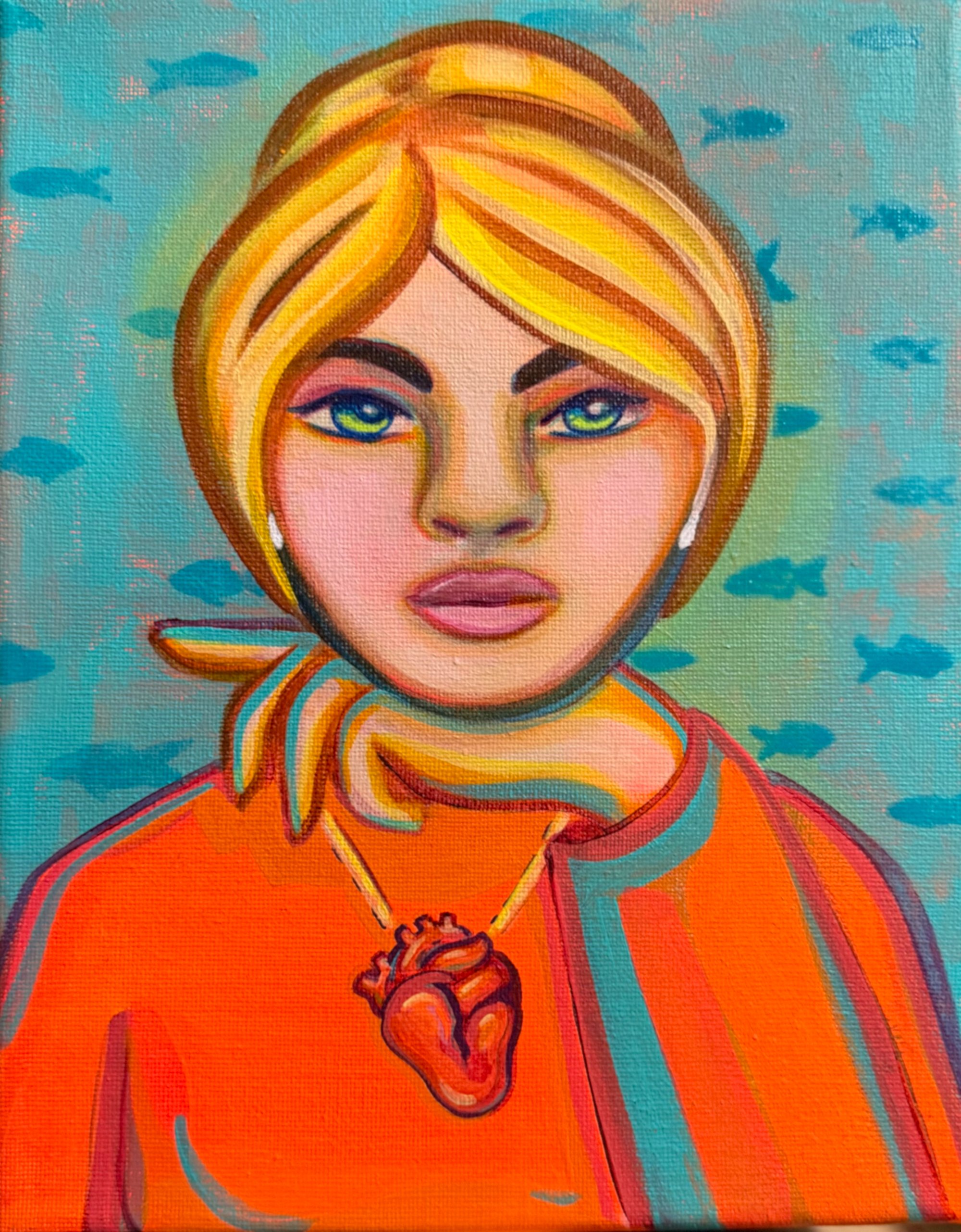 The portrait features a powerful female figure wearing an anatomical heart necklace, symbolizing emotional courage, inner truth, and resilience. Set against a turquoise background with softly swimming fish, the artwork evokes depth, intuition, and the feeling of navigating life’s emotional waters while keeping your head held high.