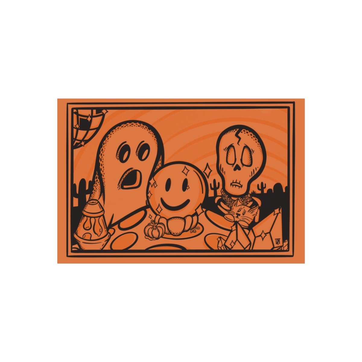 This gallery-quality poster brings a playful, slightly spooky mood to a cozy corner. Rendered in warm orange with bold black linework, the illustration shows friendly Halloween characters gathered together—ghost, carved pumpkin, skull and a charming cat—framed by a thin double border. The matte, giclée print on smooth 220gsm fine-art paper keeps contrasts crisp and colors even, so the scene reads beautifully on a living room wall, over a reading nook, or as part of a seasonal art cluster. It feels like a little autumn evening captured on paper: mischievous, comforting, and a touch nostalgic. Hang it with simple frames or lean it on a shelf to bring a low-key, vintage-inspired Halloween vibe to a cabin, apartment, or family room during fall gatherings and cozy nights in.