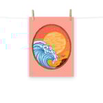 Bring laid-back beach energy to your space with the “Sunset Surf” Art Print, featuring a bold retro wave curling beneath a glowing orange sunset. Framed in a rope-style oval and set against a warm gradient sky, this vibrant coastal illustration blends vintage surf culture with modern graphic charm.